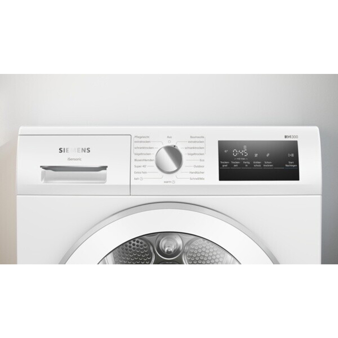 Dieser Siemens iQ300 Wäschetrockner verfügt über eine intuitive Bedienung mittels Touch Control Tasten und einer Einknopf-Programmwahl. Das LED-Display zeigt während des Betriebs nützliche Informationen wie die Restzeit, Endezeit, den Programmablaufstatus sowie Hinweise zur Filterreinigung und Kondenswasserbehälterleerung an. Die integrierte Kindersicherung bietet zusätzliche Sicherheit im Haushalt. Dank AntiVibration Design wird der Betriebsgeräuschpegel auf angenehme 63 dB reduziert.