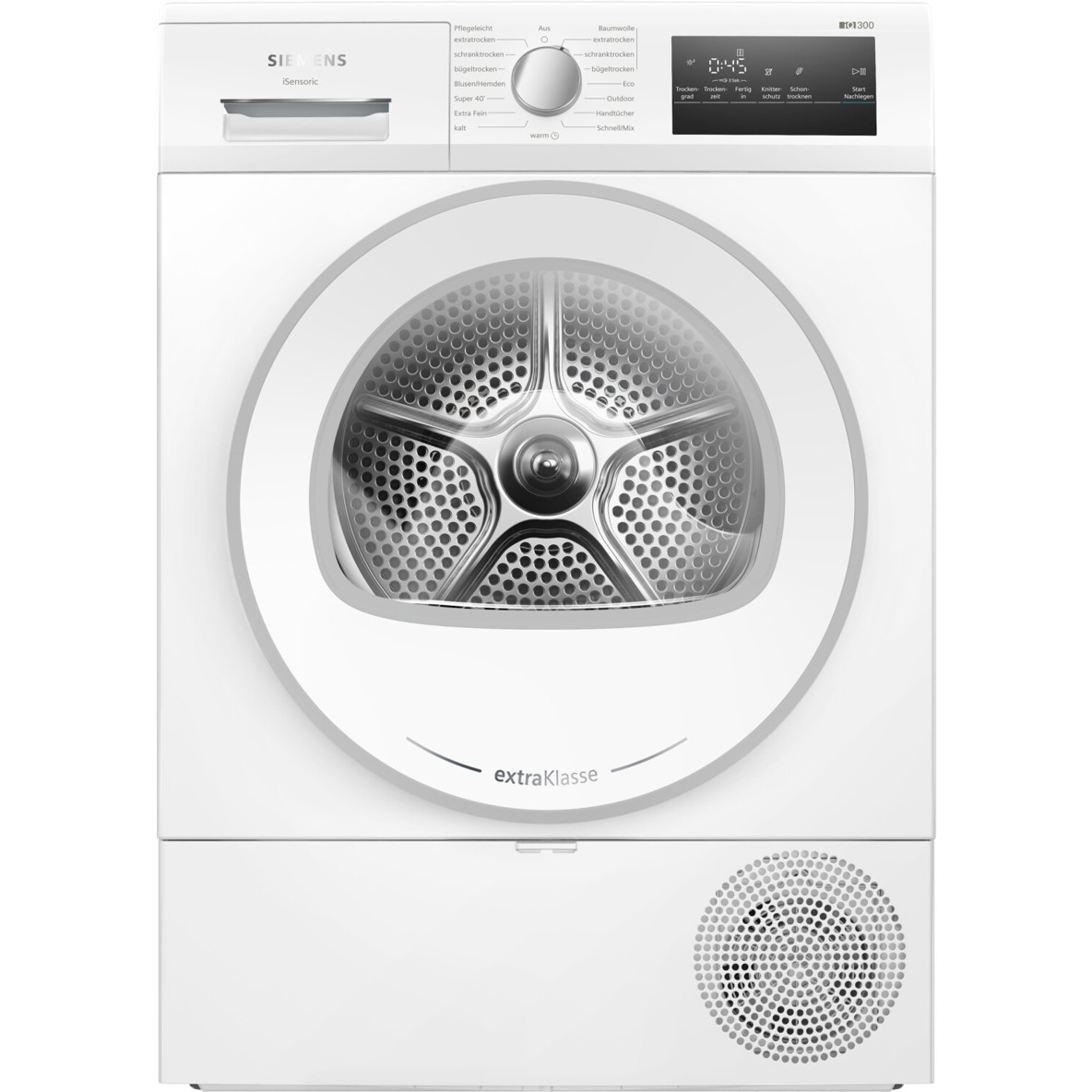 Der Siemens WT45HV94 ist ein leistungsstarker Wärmepumpentrockner in elegantem Weiß, der speziell für Haushalte von 3-4 Personen konzipiert wurde. Mit einer großzügigen Füllmenge von 8 kg und einer Vielzahl an innovativen Funktionen sorgt er für schonend getrocknete Wäsche und maximale Effizienz in Ihrem Zuhause. Das freistehende Gerät mit Frontlader-Ladeluke und einem Türanschlag auf der rechten Seite bietet flexible Aufstellvarianten, darunter unterschiebbar ab 85 cm Nischenhöhe, säulenfähig und side-by-side-fähig.